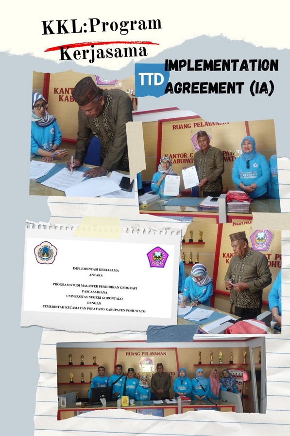 Selain kegiatan akademik dan sosial, KKL ini juga menjadi momentum penting untuk memperkuat hubungan kelembagaan. Acara dirangkaikan dengan penandatanganan Implementasi Agreement (IA) atau dokumen kerjasama antara Prodi S2 Pendidikan Geografi UNG dengan Pemerintah setempat, yang diwakili oleh Camat Popayato. Penandatanganan IA ini diharapkan dapat menjadi payung hukum bagi program-program kolaboratif di masa mendatang, memastikan bahwa ilmu dan keahlian dari Pascasarjana UNG dapat terus memberikan kontribusi nyata dalam upaya mitigasi bencana dan pengelolaan lingkungan di Desa Torosiaje dan sekitarnya.