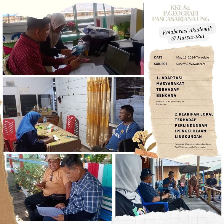 POHUWATO – Mahasiswa dan dosen Program Studi (Prodi) Magister Pendidikan Geografi Pascasarjana Universitas Negeri Gorontalo (UNG) melaksanakan kegiatan Kuliah Kerja Lapangan (KKL) selama empat hari, mulai dari tanggal 10 hingga 13 Mei 2024, di Desa Torosiaje, Kabupaten Pohuwato. KKL ini menjadi wadah vital bagi mahasiswa untuk mengintegrasikan dan mengaplikasikan teori geografi yang didapat di kelas pada Mata Kuliah Studi Kasus ke dalam konteks sosial dan lingkungan yang sesungguhnya di lapangan.